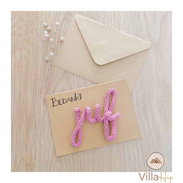 Een unieke kaart om de juf te bedanken met een cadeautje erbij. Schrijf zelf aan de binnenkant een leuke tekst en de juf kan het woordje ‘juf” van het kaartje af halen om hem ergens op te hangen. Er zit al een ophanglusje bij aan de binnenkant van het kaartje. Leuk om te geven tijdens juffendag of aan het einde van het schooljaar.
