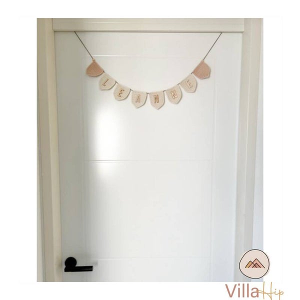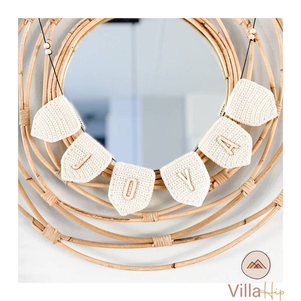 Deze vlaggenlijn is voor een naam met 3 letters en 2 lege vlaggetjes aan de buitenkant. Als afwerking zit er een klein houten kraaltje aan de vlaggenlijn. De vlaggen kunnen verschoven worden op de lijn, het gaat wat stug dus als je eenmaal de juiste afstand hebt bepaald zullen de vlaggetjes niet meer verschuiven.